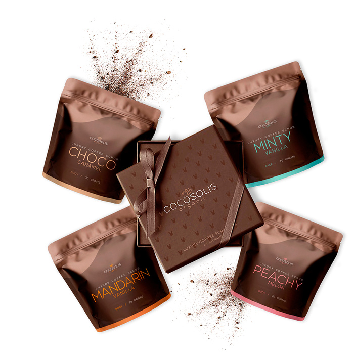Кутия с 4 луксозни скраба: три различни за тяло и един за лице. За кадифено мека и сияйна кожа още след първаа употреба!