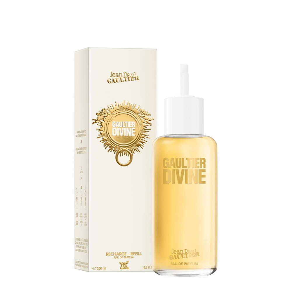 С флакони за многократно пълнене от 50 и 100 ml, Gaultier Divine празнува красотата на всички жени. И на природата. Този екологичен пълнител разполага със самозатваряща се система за включване/изключване. Лесен, но жизненоважен жест: 52% стъкло и 66% % спестен метал* за опазване на околната среда. Jean Paul го е грижа. Точно като вас.