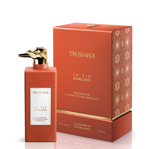 Емблематичните унисекс аромати от линията Le Vie di Milano на Trussardi, разказват за пътуване, което започва далеч и ви кара да преживеете уникалната атмосфера по улиците на Милано. Възвишената елегантност на Passeggiata in Galleria Vittorio Emanuele II е събрана в сладките върхови нотки на лешник, кафе и канела, а след това нежно се смесва в коктейл от абсолю на кокос и тубероза с нотки на Самбак жасмин. Обонятелният букет разкрива безпогрешните нотки на кедрово дърво, ванилия и бял мускус в края. Жизненост, тържественост, история, разкош! Сатененият стъклен флакон е в керемидено-червени оттенъци, със скулптурна златиста метална капачка, която точно възпроизвежда миниатюрната версия на главата на италианския Левриеро - хрътката на Trussardi.