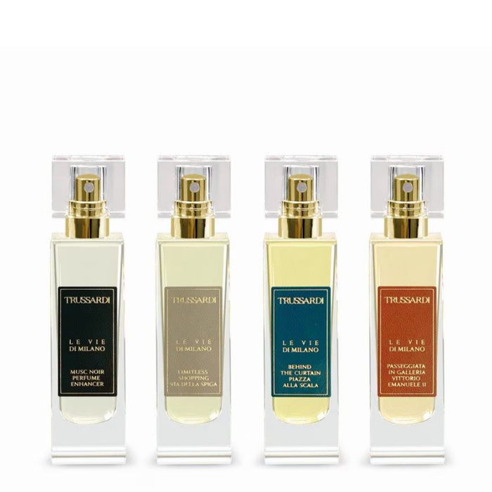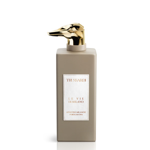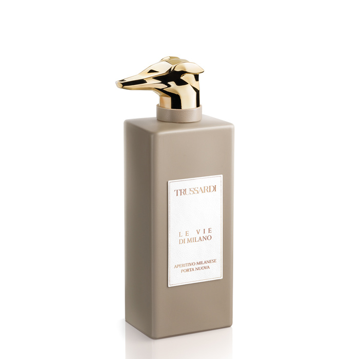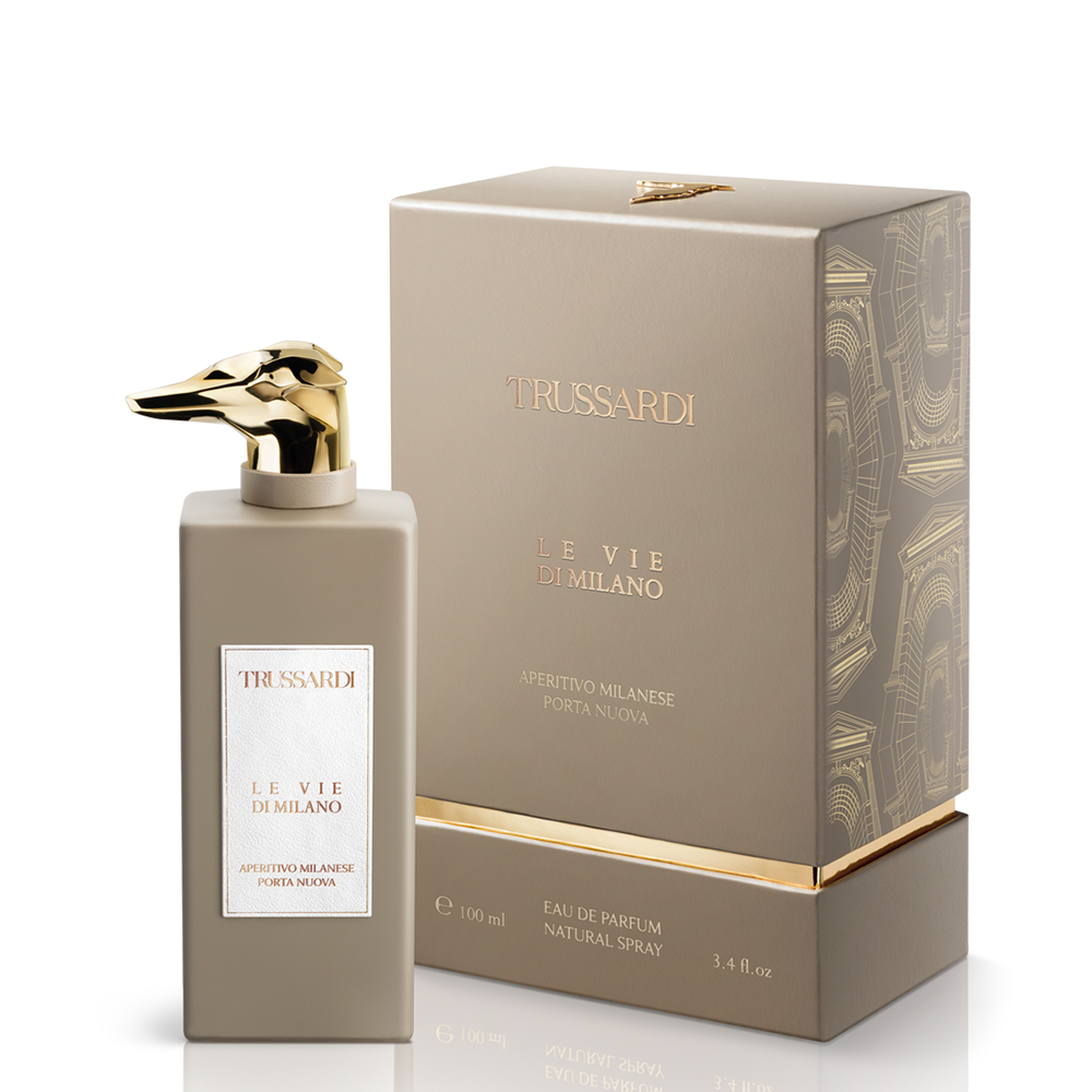 Емблематичните унисекс аромати от линията Le Vie di Milano на Trussardi, разказват за пътуване, което започва далеч и ви кара да преживеете уникалната атмосфера по улиците на Милано. Нотките на листа от мандарина, италианско нероли и калабрийски бергамот отварят букета на Aperitivo Milanese Porta Nuova. Средните нотки са заети от дълбочината на хелиотроп с амарето и ирис, които се смесват със сладките базови нотки на ванилия, бензоин и амбър. Сатененият стъклен флакон се предлага в отличителен нюанс на сивото със скулптурна златна метална капачка, която точно възпроизвежда миниатюрната версия на главата на италианския Левриеро, хрътката Trussardi.
