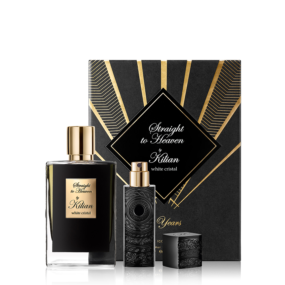 The Icon Set представя вечния многократно пълнещ се флакон от 50мл. на KILIAN и аксесоар за пътуване. Straight to Heaven, white cristal е съчетан с черен лакиран спрей за пътуване талисман.