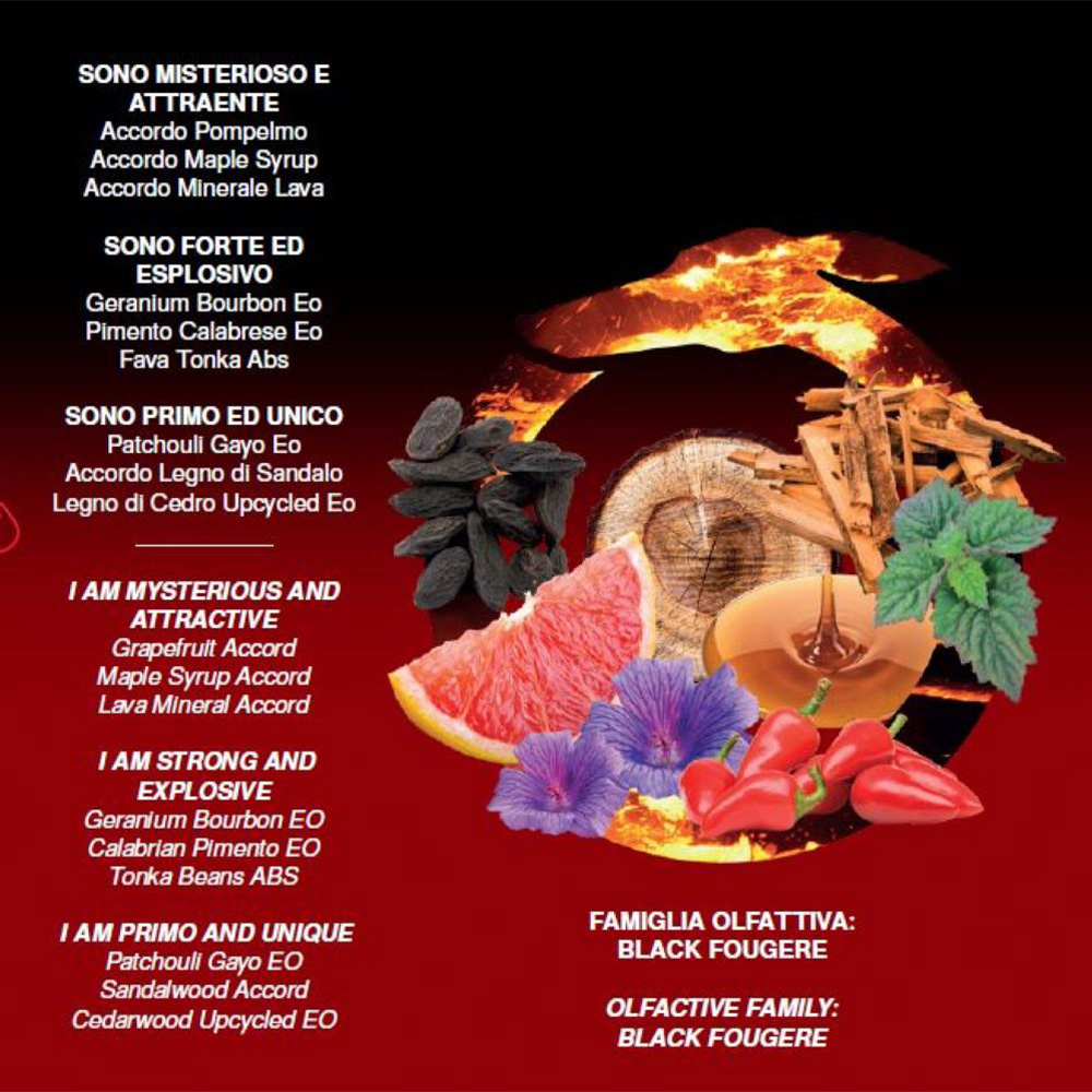 Ароматни нотки: ГРЕЙПФРУТ АКОРД, КЛЕНОВ СИРОП,МИНЕРАЛЕН ЛАВА АКОРД,ЕТЕРИЧНО МАСЛО ОТ ЗДРАВЕЦ,КАЛАБРИЙСКА ЛЮТА ЧУШКА, ЗЪРНА ТОНКА,ПАЧУЛИ,АКОРД САНДАЛОВО ДЪРВО, МАСЛО ОТ КЕДРОВО ДЪРВО