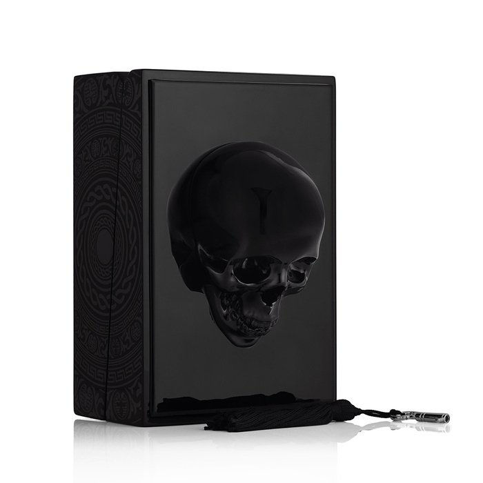 Бутилката се държи заключена с ключ на пискюл, в лакирана в черно дървена кутия. Усмихнат череп се издига като паметник, осветявайки проява на мрачно великолепие.