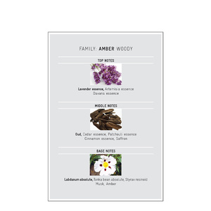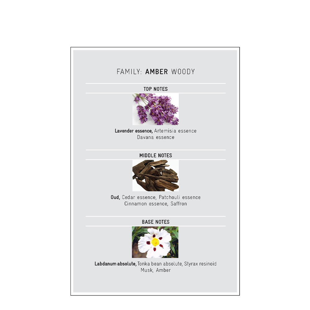 Митичен кехлибар, свързващ лабданум и ванилия, обогатен със смола и пикантни подправки, за да отговори на сладострастната дързост на нотката уд. Връхни нотки на ароматна лавандула, пелин и мащерка контрастират с тази топла и чувствена дълго продължаваща магия.