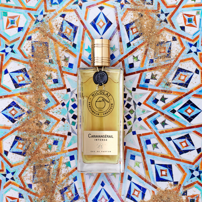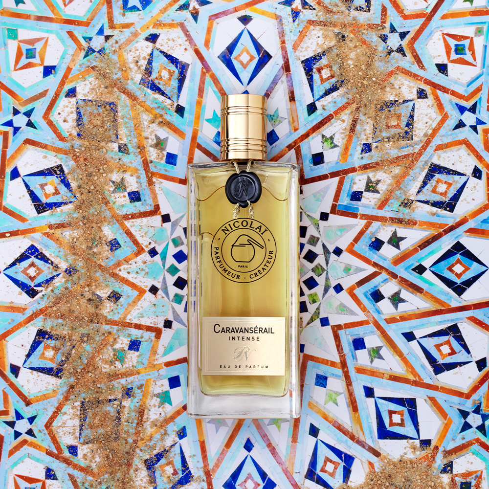 Към Леванта: пустинното приключение започва. Връзка между много земи, Caravansérail Intense е междинна спирка на пресичащите се пътища на кафе и подправки. Историческо място на гостоприемство, недалеч от безводни пустини, пионери-изследователи и пътешественици са посрещнати от горещо, пристрастяващо традиционно кафе, чиито завихряния разкриват свежите нюанси на семена от кардамон. Плодови, сладки нотки подсилват тази божествена смес, деликатно поръсена с канела и карамфил, докато дуото от сърцевина на пачули и сандалово дърво осигурява дървесен интензитет. И накрая мощната пясъчна буря от нотки на сух кехлибар подчертава безсмъртниче, ванилия и зърна тонка.