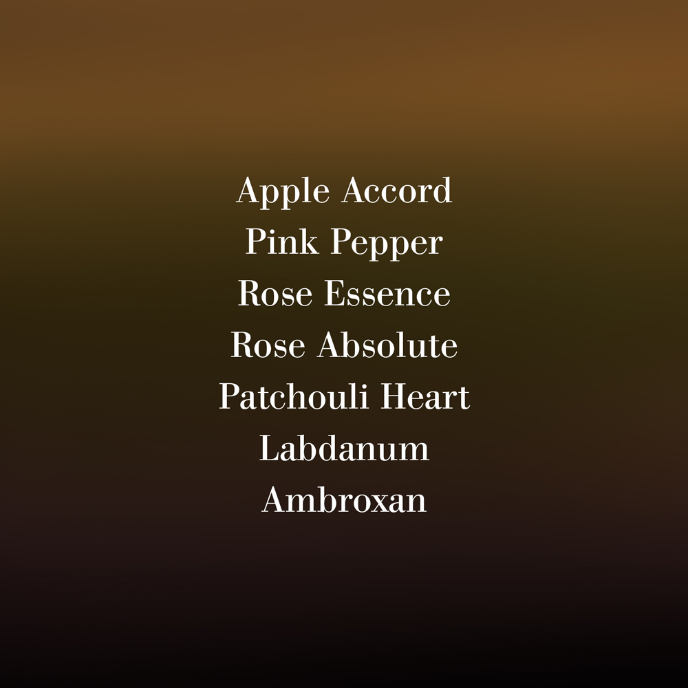 розов пипер, масло от розмарин, акорд на ябълка, масло от българска роза, турска роза абсолю, масло от карамфил, пачули, амброксан, лабданум, киприол, кастореум