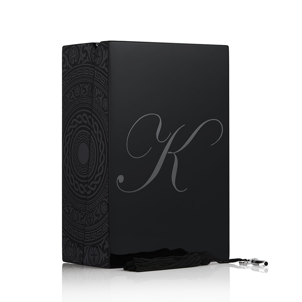 Всяка парфюмна бутилка на KILIAN PARIS се превръща в ценен предмет. Черно лакираният флакон е гравиран от различните му страни с керамична стенопис, представляваща Ахилесовият щита, и украсен със златиста плоча, върху която е издълбано името на аромата ръчно запълнено с черен емайл.