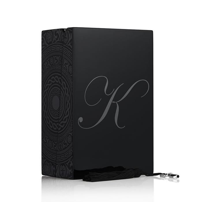 Ароматът се полага върху легло в черна лакирана дървена кутия. Кутията също е украсен с щита на Ахил и заключен със защитен ключ с пискюли, контрастиращ като сейф за съхранение на скъпоценни бижута.