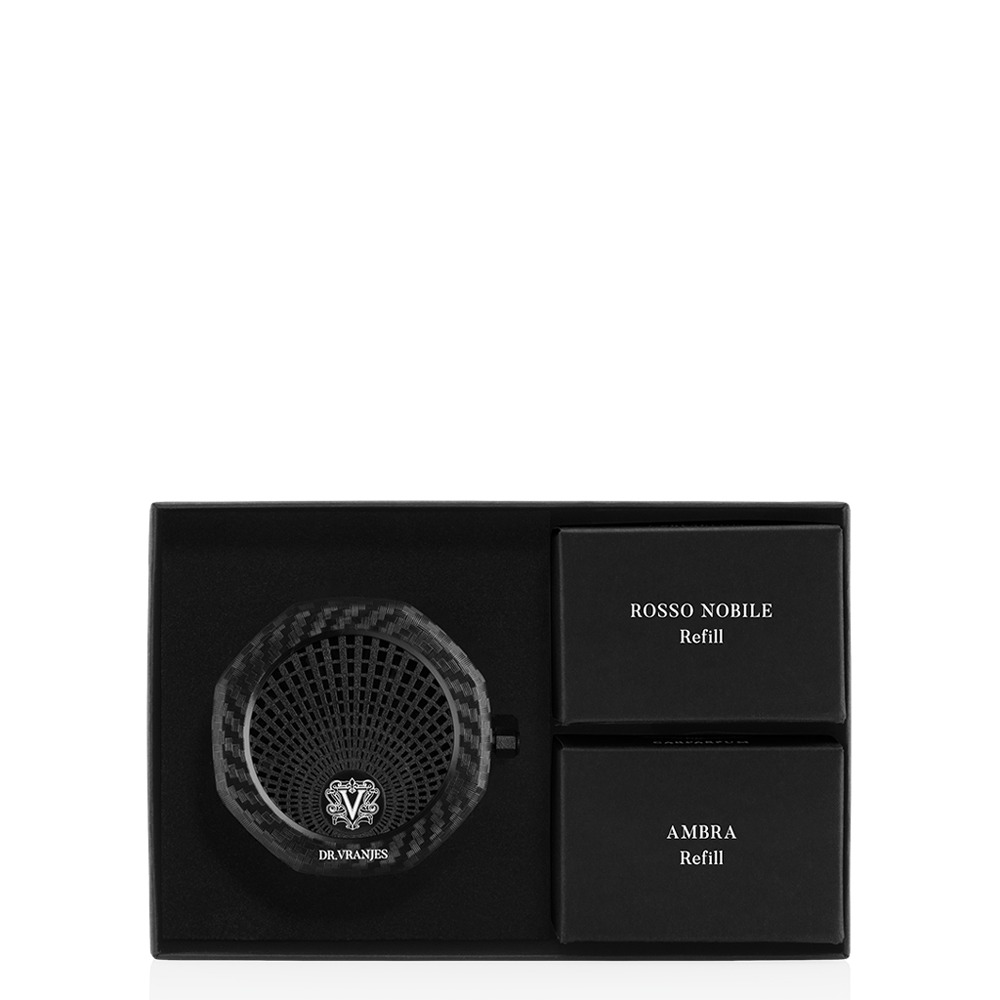 Парфюмът за кола с карбоново покритие е изискан и оригинален аксесоар за вашия автомобил. Не само, че подобрява естетиката му, но и парфюмът се разпространява изцяло в колата ви, използвайки активната си вентилация и превръщайки всяко пътуване в незабравимо преживяване. Парфюмът за кола освежава въздуха и е за многократно зареждане: Отделението за пълнител е специално проектирано да се сменя лесно при консумация. Този комплект с два пълнителя и карбонова опаковка на парфюм за кола, ще ви достави истинско удоволствие, докато пътувате във вашия автомобил. Ароматните пълнители също се продават и отделно, което позволява да изберете различно зареждане на аромат, като същевременно запазите същия флакон. Парфюмът за кола се предлага в три изключителни покрития, използващи шест от най -популярните аромати на Dr. Vranjes в света.