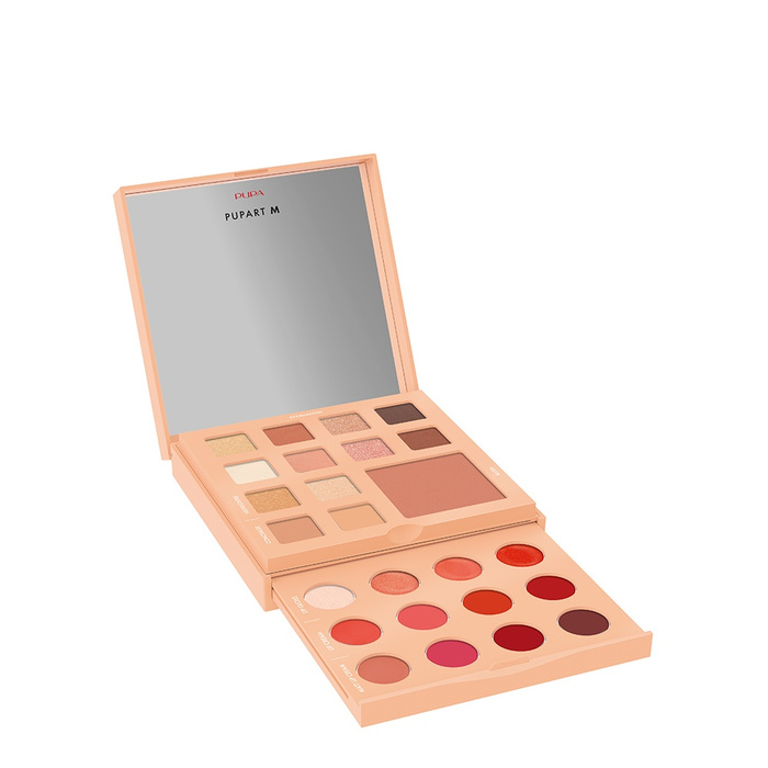Палитра от гримове за лице, очи и устни. Ружът и компактните сенки за очи придават копринено усещане за безкраен брой различни визии. Класическите кремообразни червила за меки устни с пълен цвят и гланцове със супер сияен завършек. Създайте перфектен грим за всеки повод! Доказано италианско качество и дизайн. Палитрата включва: 2 коректора, 1 компактен руж, 2 хайлайтера, 8 компактни сенки, 4 матови и 4 класически цвята за устни, 4 гланца. Дерматологично тествани продукти, чисти формули с до 96% естествено извлечени съставки. Не съдържат талк. 100% PET пластмаса за еднократна употреба с възможност за рециклиране на пластмасата. Палитрата включва: 2 коректора, 1 компактен руж, 2 хайлайтера, 8 компактни сенки, 4 матови и 4 класически цвята за устни, 4 гланца.