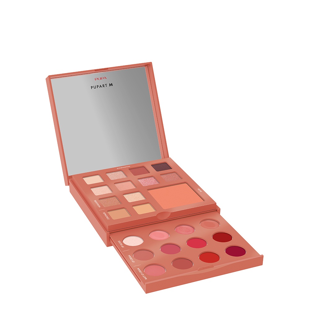 Палитра от гримове за лице, очи и устни. Ружът и компактните сенки за очи придават копринено усещане за безкраен брой различни визии. Класическите кремообразни червила за меки устни с пълен цвят и гланцове със супер сияен завършек. Създайте перфектен грим за всеки повод! Доказано италианско качество и дизайн. Палитрата включва: 2 коректора, 1 компактен руж, 2 хайлайтера, 8 компактни сенки, 4 матови и 4 класически цвята за устни, 4 гланца. Дерматологично тествани продукти, чисти формули с до 96% естествено извлечени съставки. Не съдържат талк. 100% PET пластмаса за еднократна употреба с възможност за рециклиране на пластмасата. Палитрата включва: 2 коректора, 1 компактен руж, 2 хайлайтера, 8 компактни сенки, 4 матови и 4 класически цвята за устни, 4 гланца.