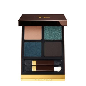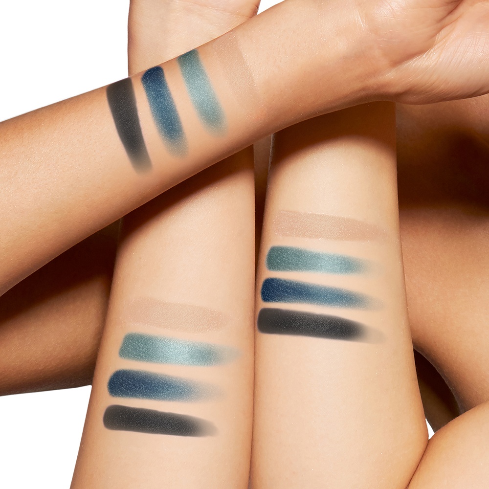 Eye Color Quad в нюанс 44 Dark Opulence включва гама от привличащи погледа блестящи сини нюанси, съчетани с матово бежово и наситено черно.