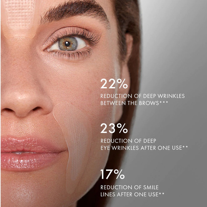Представяме ви революционно решение без игли за фини линии и бръчки. Лепенките с ретинол за заличаване на бръчките се насочват прецизно към експресионните линии чрез иновативна технология с микроконус, която е клинично доказана, че осигурява 2 пъти по-бърза абсорбция и дълбочина на активните съставки в сравнение с локалната грижа за кожата. Тези малки игловидни структури се разтварят при контакт с влагата на кожата, за да осигурят мощна смес от ретинол, витамин С и мощен пептиден комплекс.