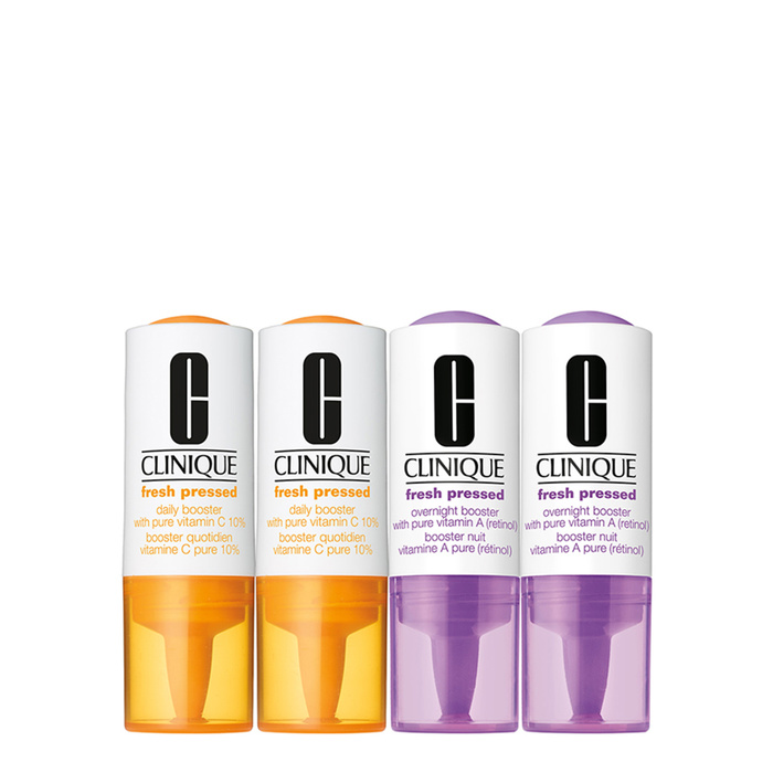 Water\Aqua\Eau , Ascorbic Acid , Glycerin , Dimethicone , Squalane , Butylene Glycol , Dipropylene Glycol , Acetyl Glucosamine , Cucumis Sativus (Cucumber) Fruit Extract , Hordeum Vulgare (Barley) Extract\Extrait DOrge , Morus Nigra (Mulberry) Root Extract , Molasses Extract\Saccharum Officinarum\Extrait De Mélasse , Laminaria Digitata Extract , Scutellaria Baicalensis Root Extract , Acetyl Hexapeptide-8 , Vitis Vinifera (Grape) Fruit Extract , Algae Extract , Palmitoyl Hexapeptide-12 , Palmitoyl Tripeptide-1 , Palmitoyl Tetrapeptide-7 , Alcaligenes Polysaccharides , Caffeine , Sucrose , Whey Protein\Lactis Protein\Protéine Du Petit-Lait , Betaine , Salicylic Acid , Glycine Soja (Soybean) Protein , Sodium Hyaluronate , Caprylyl Glycol , Sigesbeckia Orientalis (St. PaulS Wort) Extract , Bis-Peg-18 Methyl Ether Dimethyl Silane , Propylene Glycol Dicaprate , Helianthus Annuus (Sunflower) Seedcake , Allyl Methacrylates Crosspolymer , Carbomer , Glyceryl Polymethacrylate , Tromethamine , Xanthan Gum , Potassium Sorbate , Peg-8 , Polysorbate 20 , Sodium Citrate , Disodium Edta , Phenoxyethanol Rds Product Name: Fresh Pressed O/N Bstr W/Pur Vit A Division: Cl (Clinique)Ingredients: Water\Aqua\Eau , Polysorbate 20 , Dimethicone , Glycine Soja (Soybean) Oil , Butylene Glycol , Vinyl Dimethicone/Methicone Silsesquioxane Crosspolymer , Methyl Trimethicone , Bis-Peg-18 Methyl Ether Dimethyl Silane , Lauryl Peg-9 Polydimethylsiloxyethyl Dimethicone , Glycerin , Polysilicone-11 , Methyl Gluceth-20 , Retinol , Salicylic Acid , Oenothera Biennis (Evening Primrose) Flower Extract , Laminaria Saccharina Extract , Gellidiella Acerosa Extract , Cholesterol , Salvia Sclarea (Clary) Extract , Caffeine , Sigesbeckia Orientalis (St. PaulS Wort) Extract , Aminopropyl Ascorbyl Phosphate , Plankton Extract , Palmitoyl Hexapeptide-12 , Glycine Soja (Soybean) Seed Extract , Micrococcus Lysate , Hypnea Musciformis (Algae) Extract , Acetyl Hexapeptide-8 , Glycine Soja (Soybean) Protein , Tocopheryl Acetate , Whey Protein\Lactis Protein\Protéine Du Petit-Lait , Sodium Hyaluronate , Acetyl Glucosamine , Caprylyl Glycol , Carbomer , Glyceryl Polymethacrylate , Sodium Hydroxide , Peg-8 , Xanthan Gum , Calcium Chloride , Ammonium Acryloyldimethyltaurate/Vp Copolymer , Lecithin , Sodium Citrate , Disodium Edta , Bht , Sodium Benzoate , Phenoxyethanol