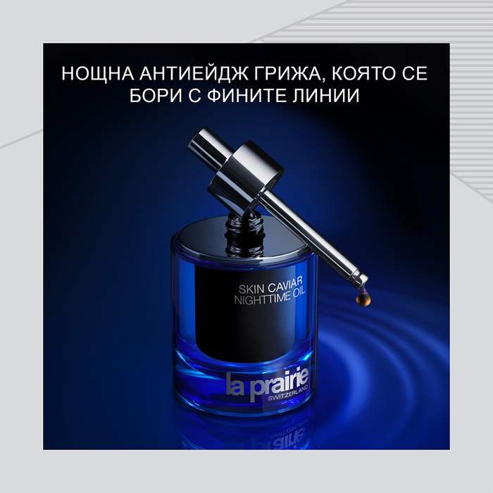 Преди 35 години La Prairie разкри пред света уникалната сила на хайвера да повдига, стяга, подхранва и ревитализира кожата. Революционната наука за хайвера на La Prairie подобрява естествените екстракти от хайвер, разширявайки границите на ефективността, за да впрегне изцяло пълния повдигащ и стягащ потенциал на активната съставка на хайвера. Обогатен с нежните свойства за намаляване на бръчките на ексклузивния Caviar Retinol на La Prairie и с копринена маслена формула, Skin Caviar Nighttime Oil на La Prairie е подходящ за всички типове кожа.