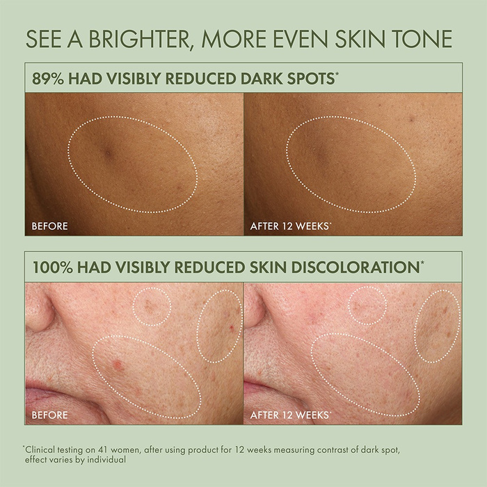 Нежен и ефективен серум с двойно действие, който има целенасочен и превантивен подход към видимата хиперпигментация на кожата, като тъмните петна. Нашият изсветляващ комплекс с гъба траметес спомага за избледняване на тъмните петна за по-равномерен тен на кожата. Нашата комбинация от рейши, чага и корен от женско биле помага да се прекъсване на циклите на раздразнение, които могат да доведат до по-нататъшно обезцветяване.