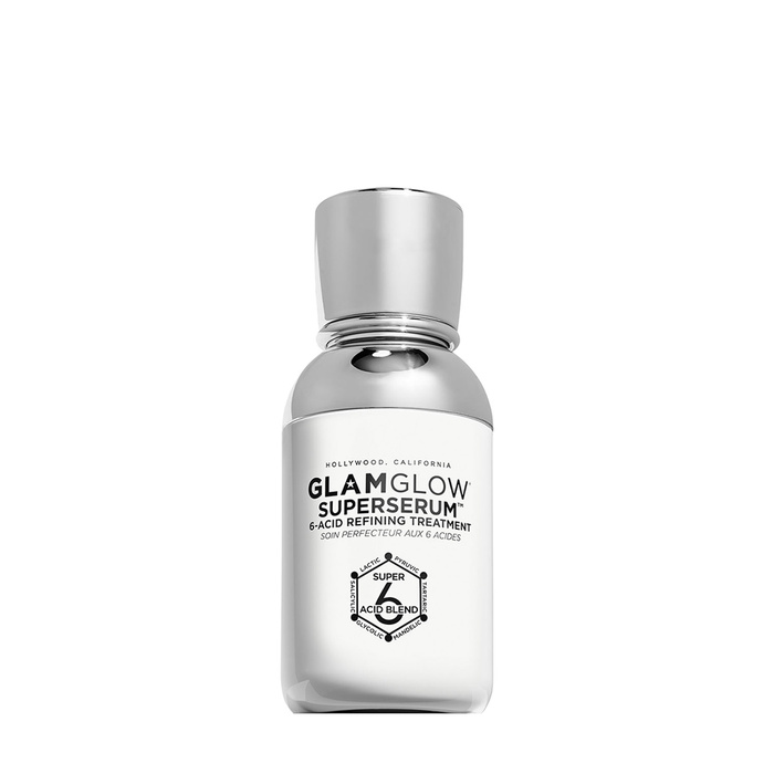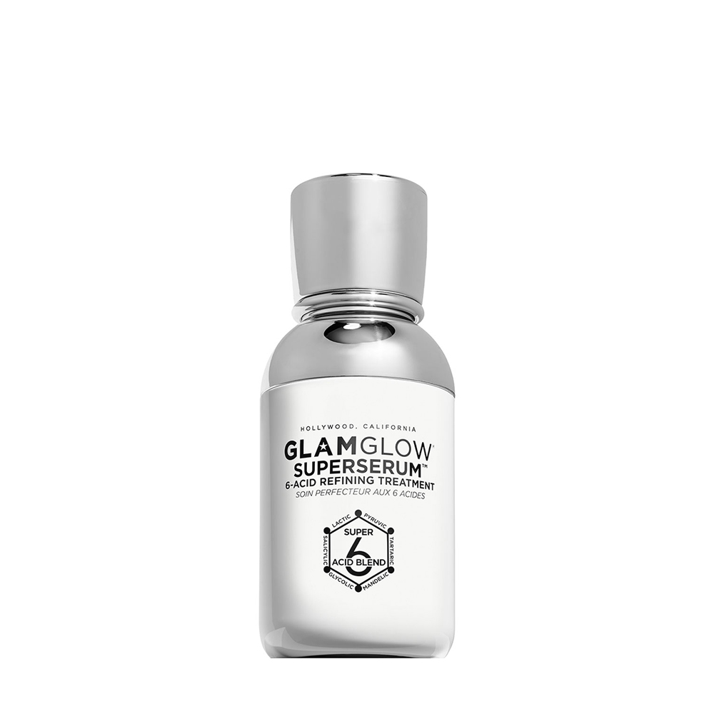 SUPERSERUM™ 6-Acid Refining Treatment е серум с копринена текстура, съдържащ ексклузивната формула на GLAMGLOW®, Super Six Acid Blend, с шест супер киселини и активен въглен за моментално изгладени пори и сияйна, плътна кожа.