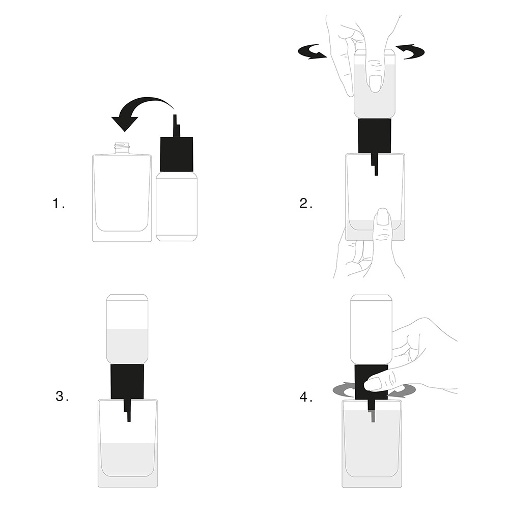Започнете пълненето на бутилката си, като внимателно извадите пулверизатора. Сглобете рефила с флакона и не забравяйте да ги държите вертикално. Дозаторът със специален механизъм ще спре прехвърлянето на парфюма автоматично, след като бутилката се напълни.