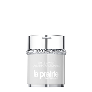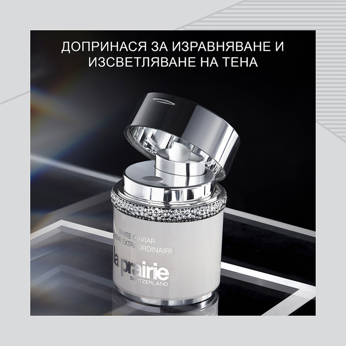 White Caviar Crème Extraordinaire премахва всякакви пигментни петна и озарява кожата. Този овлажняващ крем съчетава повдигащи и стягащи екстракти от златен хайвер с революционната избистряща тена молекула Lumidose, патент на La Prairie.